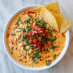 Take your Spicy Cowboy Queso Dip Recipe up a notch by serving it in a rustic cast iron skillet straight from stovetop to table – it keeps the dip warm and adds charm. Alternatively, serve it in a hollowed-out bread bowl for a fun, shareable experience. Setting out small ramekins for individual portions makes it feel special and keeps everything neat.