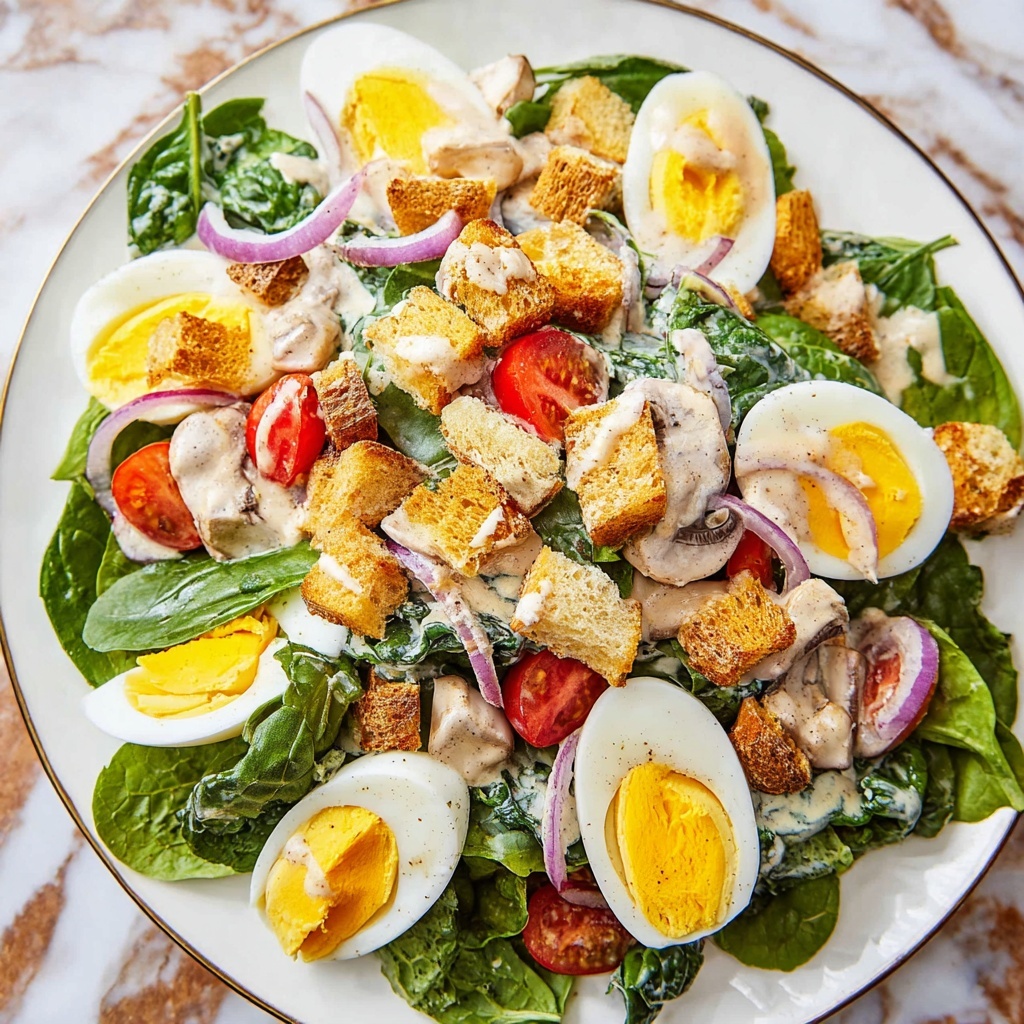 In a large salad bowl, layer your fresh baby spinach first as the crisp green base. Follow it with beautifully sliced hard-boiled eggs for a soft texture and mild flavor. Next, add the halved grape tomatoes for juicy sweetness, sliced fresh mushrooms for earthiness, and thinly sliced red onion for a little bite. Top everything off with crunchy croutons to bring that irresistible crunch contrast.