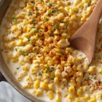 Garnishing your creamed corn with freshly chopped parsley is a classic choice that brightens the dish visually and adds a subtle herbaceous note. For a bit of extra zing, you can also sprinkle a light dusting of smoked paprika or a few crispy fried shallots to add texture and depth.