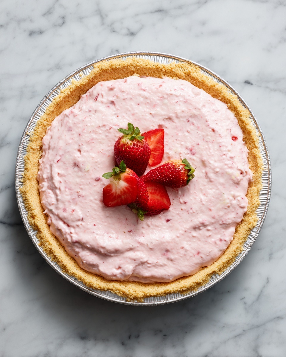 Before serving, add the finishing touches. Arrange fresh strawberry slices atop the pie to add vibrant color and a fresh burst of flavor. Optionally, add dollops of whipped cream to make each slice feel like a special occasion. Slice carefully with a sharp knife, and enjoy each bite of this creamy, fruity masterpiece that feels like summer captured on a plate.