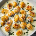 This Sweet Potato Gnocchi Pasta features tender, pillowy gnocchi made from mashed sweet potatoes, flour, and egg yolk, lightly sautéed in a fragrant butter, garlic, and fresh sage sauce. Finished with Parmesan cheese and a touch of black pepper, it’s a comforting Italian-inspired main dish perfect for a cozy meal.