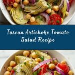 A vibrant and refreshing Tuscan Artichoke Tomato Salad featuring cherry tomatoes, marinated artichoke hearts, chickpeas, and fresh herbs tossed in a zesty red wine vinaigrette. Perfect as a light meal or side dish, this salad is easy to prepare in just 17 minutes and offers a delightful blend of Mediterranean flavors.