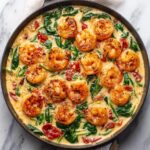 This Tuscan Shrimp with Spinach, Artichokes, and Sun-Dried Tomatoes is a savory and creamy skillet dish featuring perfectly seared shrimp simmered in a luscious sauce made with heavy cream, Parmesan cheese, garlic, and Italian seasoning. Enhanced with fresh spinach, tangy artichoke hearts, and vibrant sun-dried tomatoes, this Italian-inspired recipe is quick to prepare and perfect as a comforting main course. It’s naturally gluten-free and can be served over pasta, rice, or mashed potatoes for a satisfying meal.