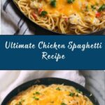 Ultimate Chicken Spaghetti is a creamy, cheesy baked pasta dish featuring tender shredded chicken, sautéed vegetables, and a flavorful blend of cream soups and spices, all baked to perfection with a delicious cheese topping.