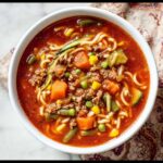 If you’re craving a hearty and comforting bowl of soup that combines the warmth of homemade broth with the satisfying bite of noodles and fresh vegetables, the Vegetable Beef Ramen Soup Recipe is exactly what you need. This delightful dish brings together lean ground beef simmered in a flavorful V-8 vegetable juice base, enriched with a savory onion soup mix and perfectly cooked ramen noodles, making it a wholesome meal that bursts with color, texture, and robust taste in every spoonful.