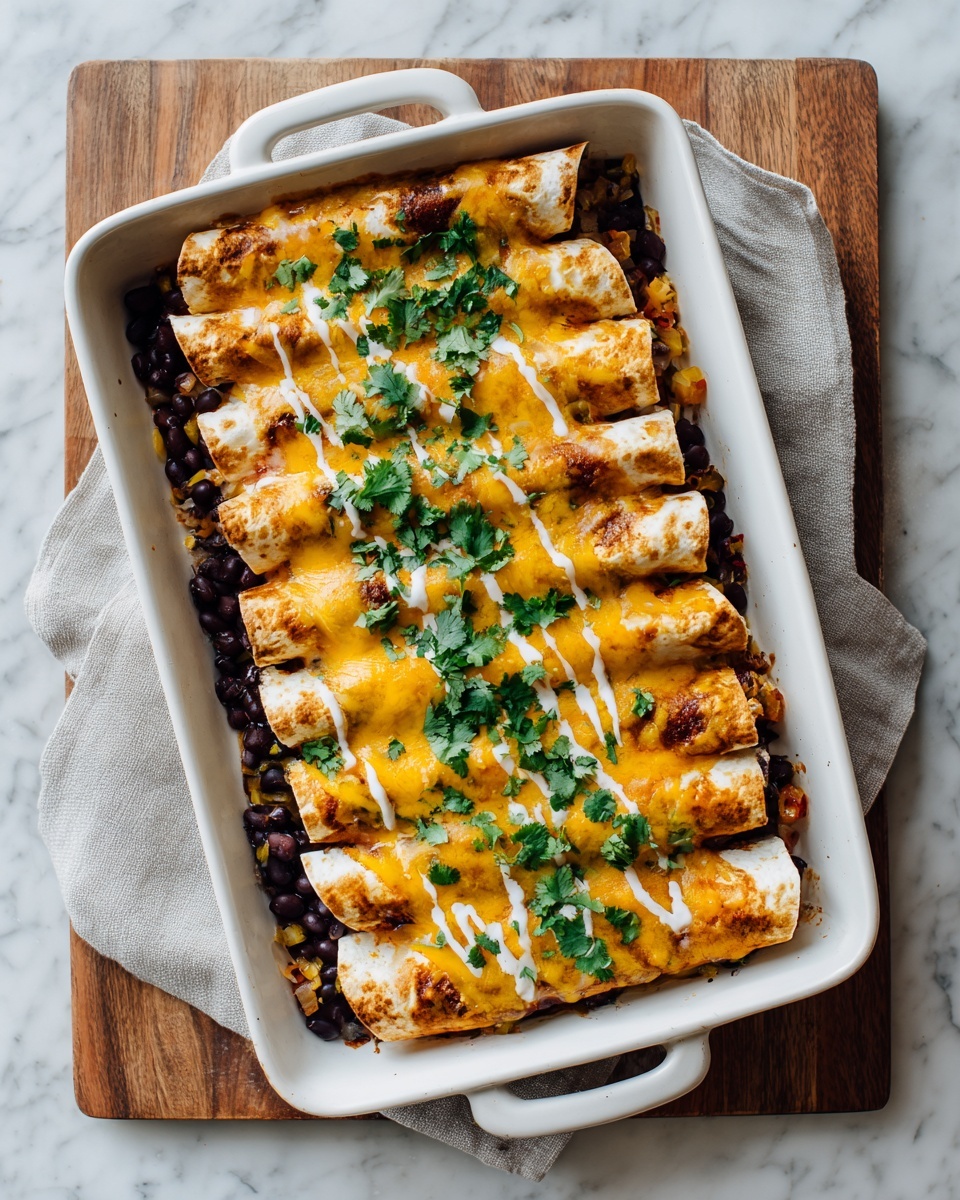 These Veggie and Black Bean Enchiladas are a flavorful, easy-to-make Mexican casserole packed with nutritious vegetables and protein-rich black beans. Perfect for a wholesome meatless dinner, they are baked to perfection with melted cheese and a rich enchilada sauce, then garnished with fresh cilantro for a vibrant finish.